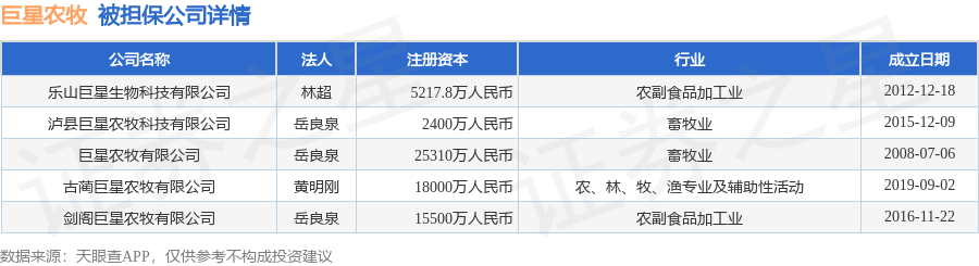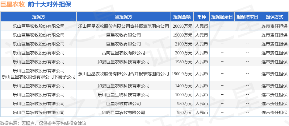 巨星农牧1月15日披露14笔对外担保,被担保公司10家。担保金额排在前十的对外担保明细如下表: