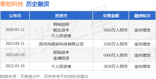 证券之星消息,根据天眼查APP于1月12日公布的信息整理,泰铂(上海)环保科技股份有限公司定向增发融资,融资额5660万人民币,参与投资的机构包括明裕创投,毅达资本,个人投资者。