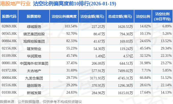 从沽空比例偏离度来看,绿城服务、锦艺集团控股、旭辉控股集团沽空比例偏离度位居行业前三,分别为103.54%、92.7%、82.33%。