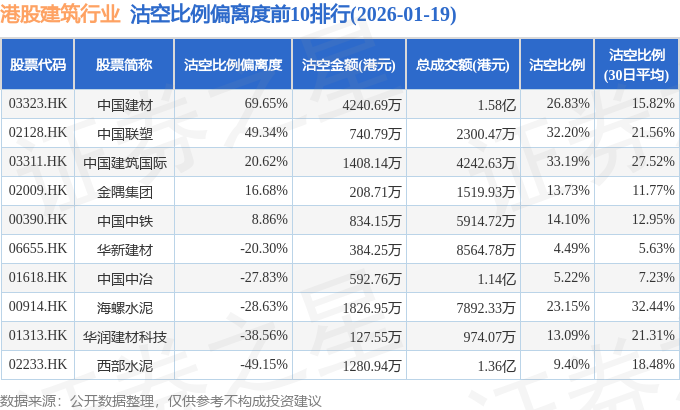从沽空比例偏离度来看,中国建材、中国联塑、中国建筑国际沽空比例偏离度位居行业前三,分别为69.65%、49.34%、20.62%。