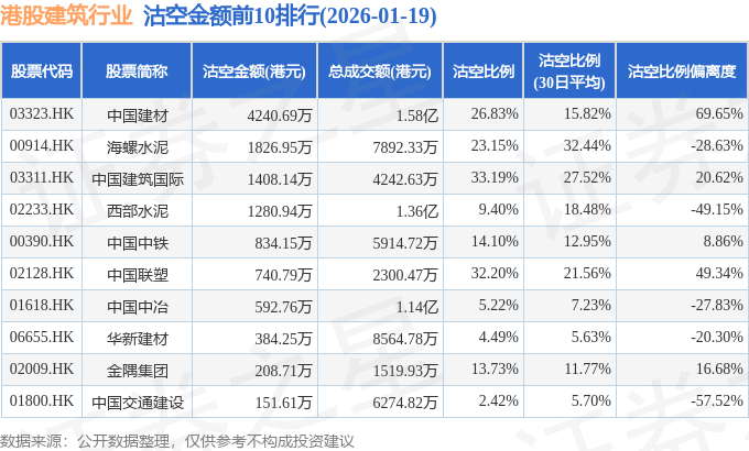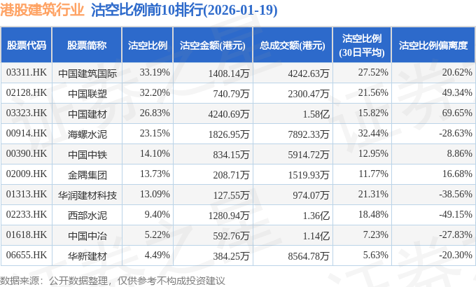 从沽空比例来看,中国建筑国际、中国联塑、中国建材沽空比例位居行业前三,分别为33.19%、32.2%、26.83%。