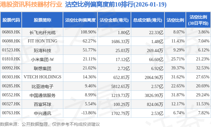从沽空比例偏离度来看,长飞光纤光缆、FIT HON TENG、珩湾科技沽空比例偏离度位居行业前三,分别为108.9%、62.27%、51.77%。