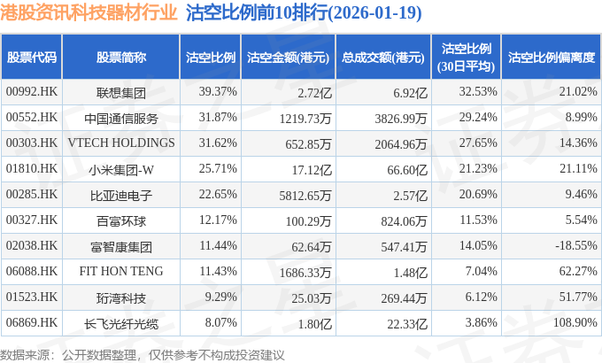 从沽空比例来看,联想集团、中国通信服务、VTECH HOLDINGS沽空比例位居行业前三,分别为39.37%、31.87%、31.62%。