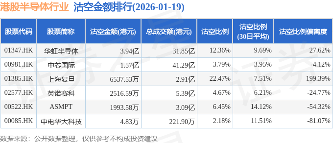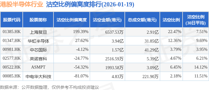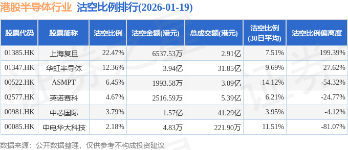 从沽空比例来看,上海复旦、华虹半导体、ASMPT沽空比例位居行业前三,分别为22.47%、12.36%、6.45%。