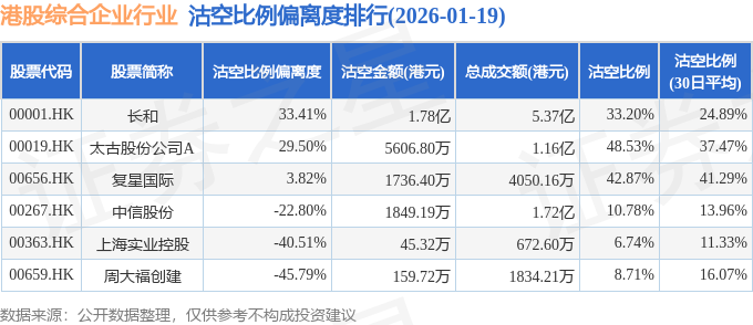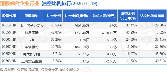 从沽空比例偏离度来看,长和、太古股份公司A、复星国际沽空比例偏离度位居行业前三,分别为33.41%、29.5%、3.82%。