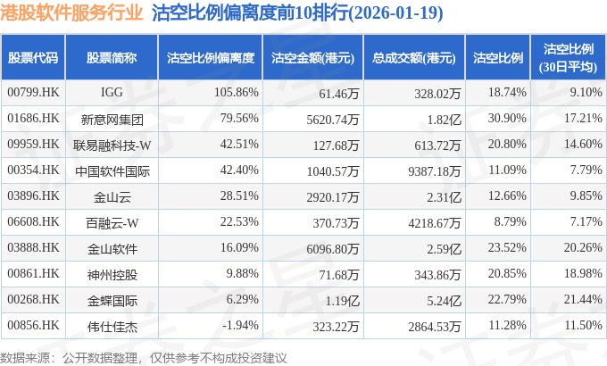 从沽空比例偏离度来看,IGG、新意网集团、联易融科技-W沽空比例偏离度位居行业前三,分别为105.86%、79.56%、42.51%。