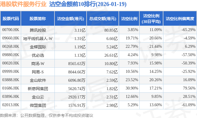 证券之星消息,1月19日港交所披露数据显示,当日港股软件服务行业的168只个股中有42只被沽空,总沽空股数为9389.09万股,总沽空金额为11.34亿元(港元),而当日软件服务行业的总成交金额为196.67亿元(港元),沽空比例为5.76%。当日软件服务行业总体跌1.17%。