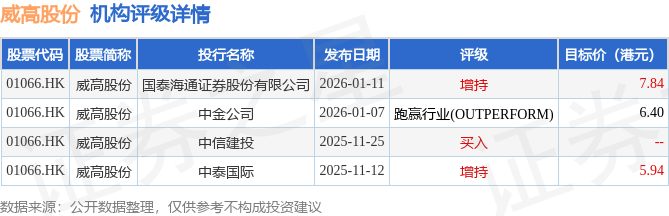 截至2026年1月19日收盘,威高股份(01066.HK)报收于5.15港元,下跌4.81%,成交量3479.32万股,成交额1.82亿港元。投行对该股的评级以增持为主,近90天内共有2家投行给出增持评级,近90天的目标均价为6.73港元。国泰海通证券股份有限公司最新一份研报给予威高股份增持评级,目标价7.84港元。