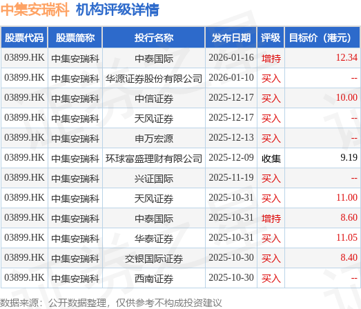 投行对该股的评级以买入为主,近90天内共有9家投行给出买入评级,近90天的目标均价为10.08港元。中泰国际最新一份研报给予中集安瑞科增持评级,目标价12.34港元。