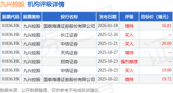 投行对该股的评级以增持为主,近90天内共有3家投行给出增持评级,近90天的目标均价为18.88港元。国泰海通证券股份有限公司最新一份研报给予九兴控股增持评级,目标价16.81港元。