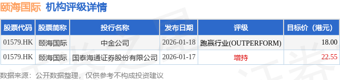 投行对该股的评级以跑赢行业(OUTPERFORM)为主,近90天内共有1家投行给出跑赢行业(OUTPERFORM)评级,近90天的目标均价为20.27港元。中金公司最新一份研报给予颐海国际跑赢行业(OUTPERFORM)评级,目标价18港元。