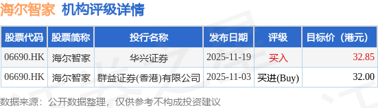 截至2026年1月20日收盘,海尔智家(06690.HK)报收于26.78港元,上涨1.06%,成交量2413.95万股,成交额6.48亿港元。投行对该股的评级以买进(Buy)为主,近90天内共有1家投行给出买进(Buy)评级,近90天的目标均价为32.42港元。华兴证券最新一份研报给予海尔智家买入评级,目标价32.85港元。