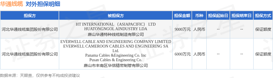 华通线缆1月19日披露2笔对外担保,被担保公司9家。对外担保明细如下表: