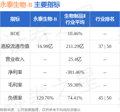 永泰生物-B港股市值16.98亿港元,在生物制品Ⅱ行业中排名第37。主要指标见下表: