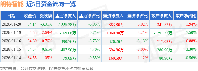 证券之星消息,截至2026年1月20日收盘,朗特智能(300916)报收于34.14元,下跌3.91%,换手率5.45%,成交量5.09万手,成交额1.76亿元。