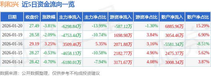 证券之星消息,截至2026年1月20日收盘,利和兴(301013)报收于27.49元,下跌3.81%,换手率8.58%,成交量16.24万手,成交额4.5亿元。