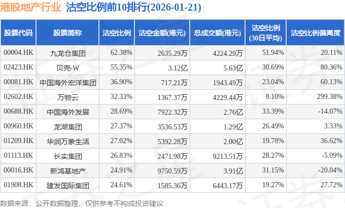从沽空比例来看,九龙仓集团、贝壳-W、中国海外宏洋集团沽空比例位居行业前三,分别为62.38%、55.35%、36.9%。
