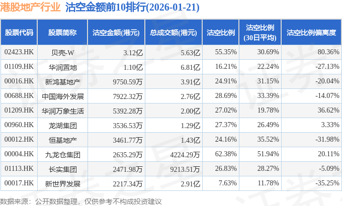 从沽空金额来看,贝壳-W、华润置地、新鸿基地产沽空金额位居行业前三,分别为3.12亿港元、1.1亿港元、9750.59万港元。