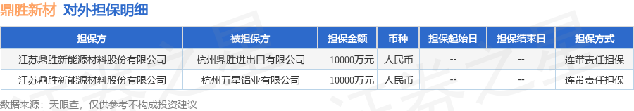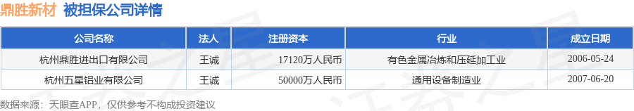 鼎胜新材1月20日披露2笔对外担保,被担保公司2家。对外担保明细如下表: