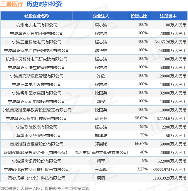 通过天眼查大数据分析,宁波三星医疗电气股份有限公司共对外投资了19家企业,参与招投标项目760次;财产线索方面有商标信息26条,专利信息1526条,著作权信息71条;此外企业还拥有行政许可28个。据2024年报数据,三星医疗商誉15.6亿元,同比减0.43%。长期股权投资25.79亿元,同比增6.2%。