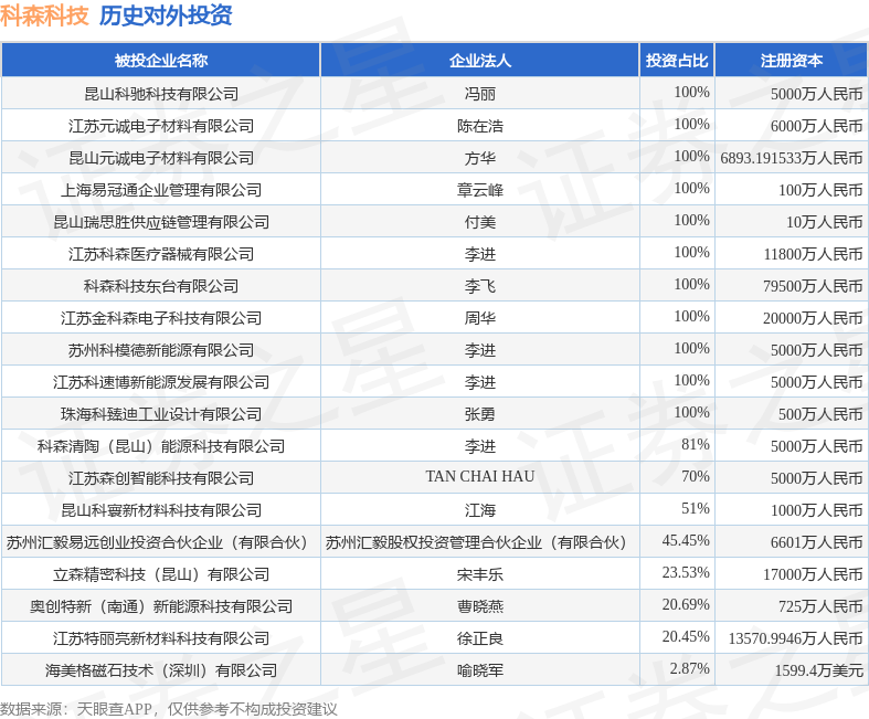 证券之星消息,根据天眼查APP显示,科森科技(603626.SH)新增一起对外投资事件,被投资公司为昆山科驰科技有限公司,法定代表人冯丽,投资占比为100%。该公司从事计算机、通信和其他电子设备制造业,注册资本为5000万人民币。目前,科森科技共存在对外投资19项,详见下表: