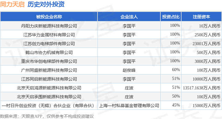 证券之星消息,根据天眼查APP显示,同力天启(605286.SH)新增一起对外投资事件,被投资公司为北京天启承围新能源科技有限公司,法定代表人庄波,投资占比为50%。该公司从事科技推广和应用服务业,注册资本为100万人民币。目前,同力天启共存在对外投资10项,详见下表: