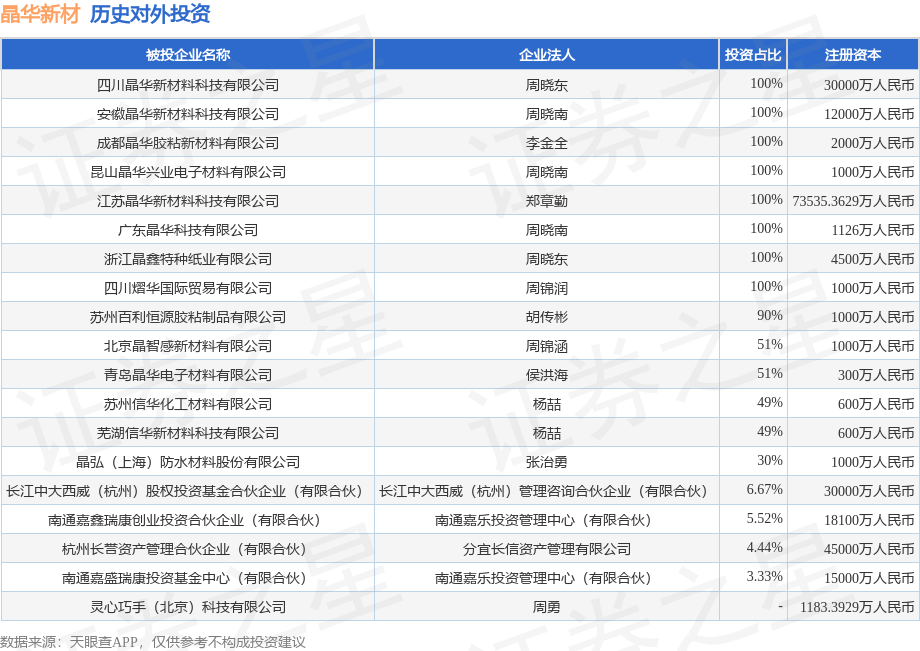 通过天眼查大数据分析,上海晶华胶粘新材料股份有限公司共对外投资了18家企业,参与招投标项目6次;财产线索方面有商标信息81条,专利信息76条,著作权信息2条;此外企业还拥有行政许可51个。据2024年报数据,晶华新材商誉1972.07万元,同比未变化。长期股权投资149.43万元,同比减10.8%。