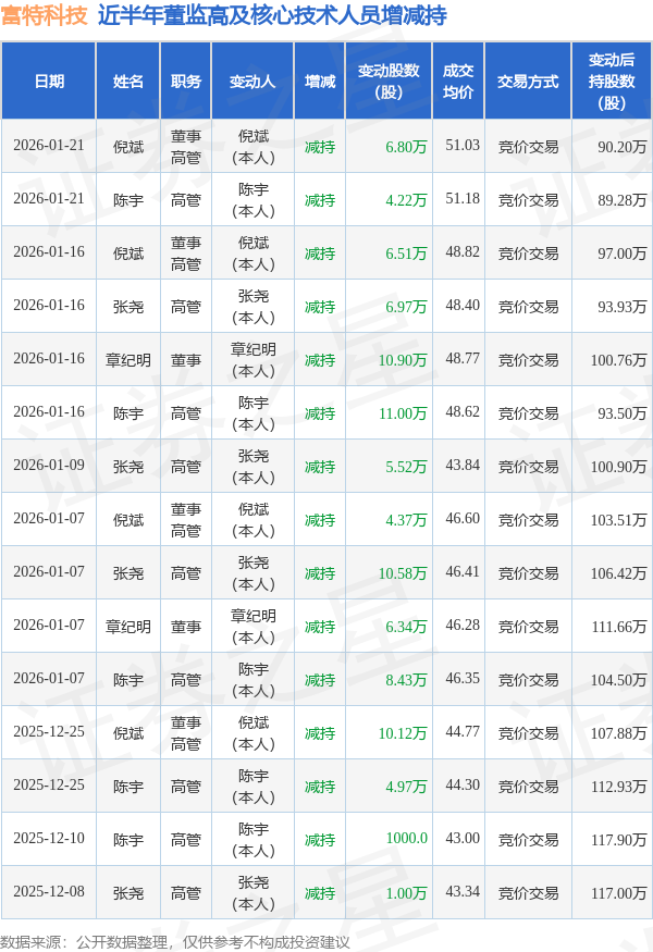 富特科技近半年内的董监高及核心技术人员增减持详情如下: