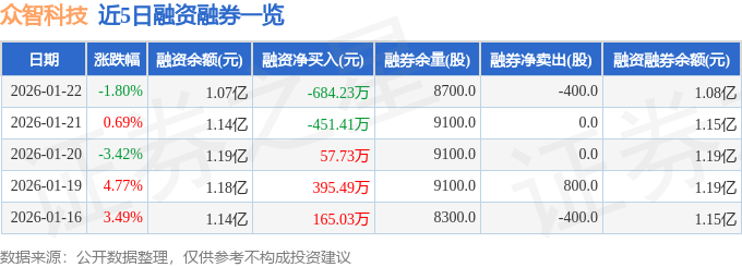 证券之星消息,截至2026年1月22日收盘,众智科技(301361)报收于37.13元,下跌1.8%,换手率10.52%,成交量3.2万手,成交额1.19亿元。