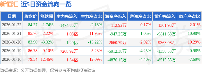证券之星消息,截至2026年1月22日收盘,新恒汇(301678)报收于84.27元,下跌1.74%,换手率16.72%,成交量8.01万手,成交额6.78亿元。