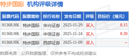 投行对该股的评级以买入为主,近90天内共有3家投行给出买入评级,近90天的目标均价为8.23港元。华兴证券最新一份研报给予特步国际买入评级,目标价8.15港元。