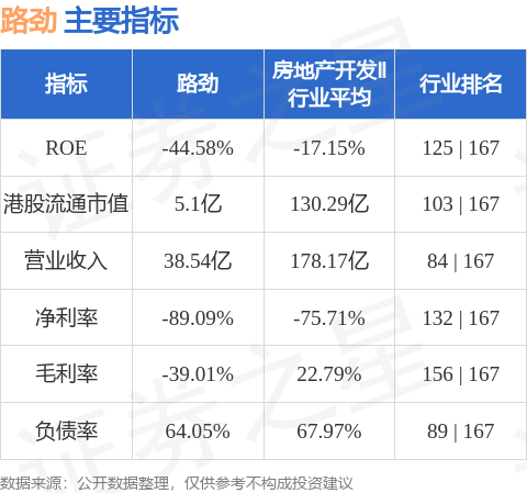 路劲港股市值5.1亿港元,在房地产开发Ⅱ行业中排名第103。主要指标见下表: