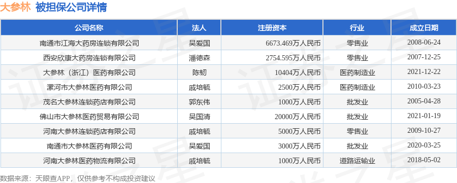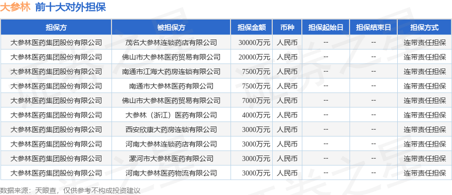 大参林1月22日披露14笔对外担保,被担保公司12家。担保金额排在前十的对外担保明细如下表: