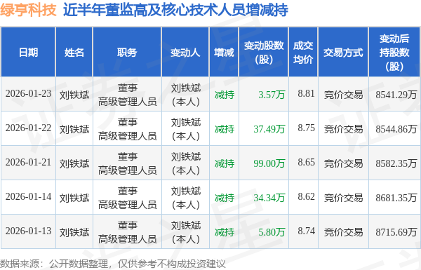 绿亨科技近半年内的董监高及核心技术人员增减持详情如下: