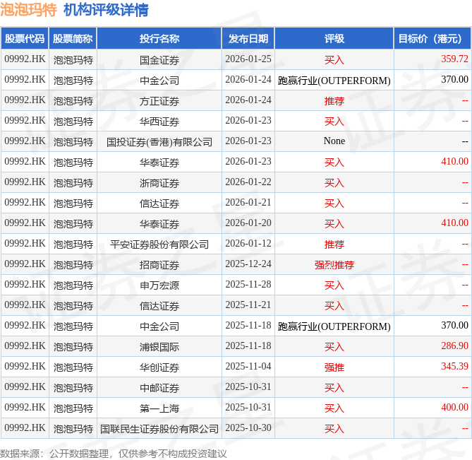 投行对该股的评级以买入为主,近90天内共有12家投行给出买入评级,近90天的目标均价为369港元。国金证券最新一份研报给予泡泡玛特买入评级,目标价359.72港元。