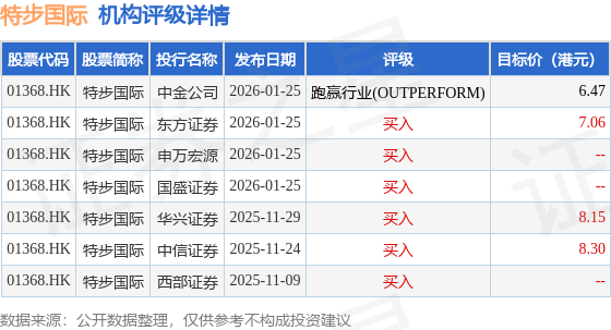投行对该股的评级以买入为主,近90天内共有6家投行给出买入评级,近90天的目标均价为7.49港元。中金公司最新一份研报给予特步国际跑赢行业(OUTPERFORM)评级,目标价6.47港元。