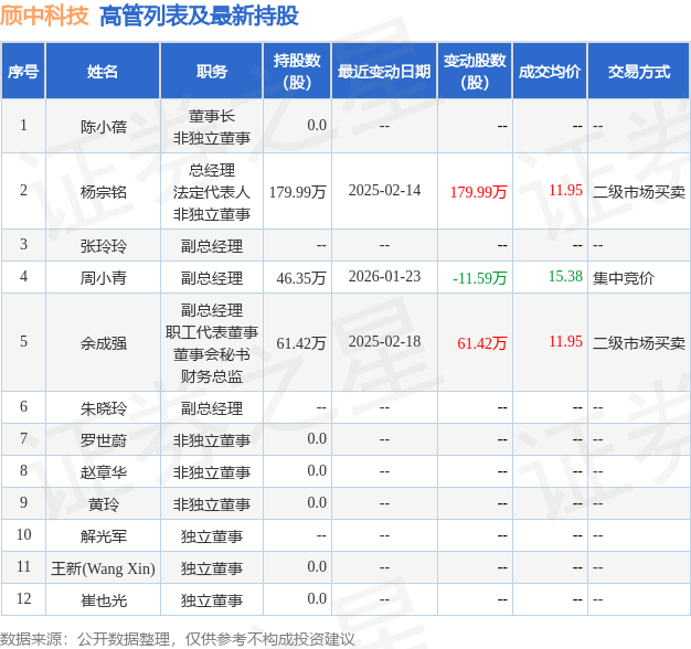 颀中科技近半年内的董监高及核心技术人员增减持详情如下: