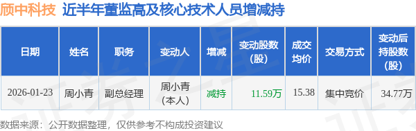 证券之星消息,根据1月26日市场公开信息、上市公司公告及交易所披露数据整理,颀中科技(688352)最新董监高及相关人员股份变动情况:2026年1月23日公司副总经理周小青共减持公司股份11.59万股,占公司总股本为0.0097%。变动期间公司股价下跌0.52%,1月23日当日收盘报15.38元。