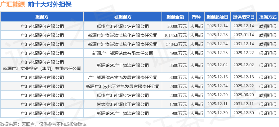 广汇能源1月26日披露14笔对外担保,被担保公司9家。担保金额排在前十的对外担保明细如下表: