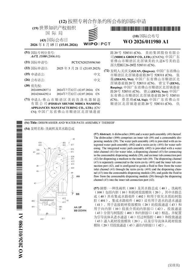 证券之星消息,根据企查查数据显示美的集团(000333)公布了一项国际专利申请,专利名为“洗碗机及其水路总成”,专利申请号为PCT/CN2025/096360,国际公布日为2026年1月15日。