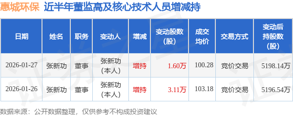 证券之星消息,根据1月28日市场公开信息、上市公司公告及交易所披露数据整理,惠城环保(300779)最新董监高及相关人员股份变动情况:2026年1月27日公司董事张新功共增持公司股份1.6万股,占公司总股本为0.008%。变动期间公司股价下跌1.68%,1月27日当日收盘报101.15元。