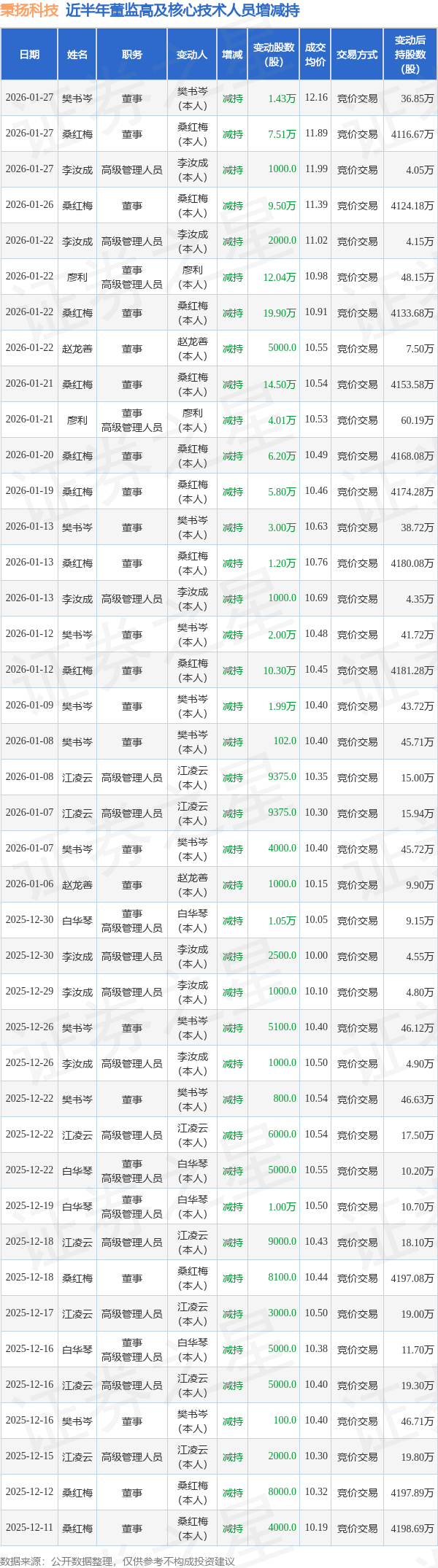 秉扬科技近半年内的董监高及核心技术人员增减持详情如下: