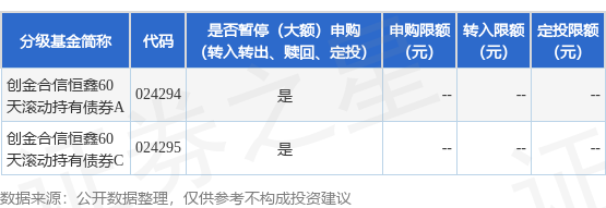 证券之星消息,1月29日创金合信基金管理有限公司发布《创金合信恒鑫60天滚动持有债券型证券投资基金暂停大额申购(含定期定额投资)、大额转换转入业务的公告》。公告中提示,为保护基金份额持有人利益,自2026年1月30日起创金合信恒鑫60天滚动持有债券型证券投资基金暂停大额申购(含定期定额投资)、大额转换转入业务,申购、转换转入上限金额为0.1万元,下属分级基金调整明细如下: