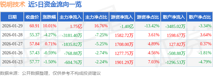 证券之星消息,锐明技术1月29日涨停收盘,收盘价60.91元。该股于9点30分涨停,13次打开涨停,截止收盘封单资金为1985.06万元,占其流通市值0.26%。
