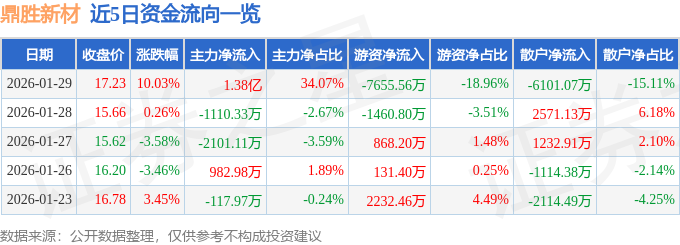 1月29日的资金流向数据方面,主力资金净流入1.38亿元,占总成交额34.07%,游资资金净流出7655.56万元,占总成交额18.96%,散户资金净流出6101.07万元,占总成交额15.11%。