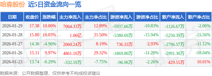 证券之星消息,哈森股份1月29日涨停收盘,收盘价17.38元。该股于9点31分涨停,13次打开涨停,截止收盘封单资金为962.33万元,占其流通市值0.25%。