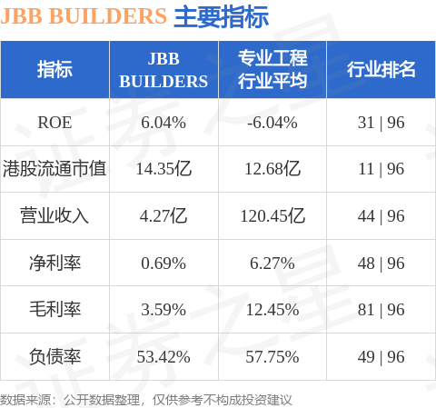 JBB BUILDERS港股市值14.35亿港元,在专业工程行业中排名第11。主要指标见下表:
