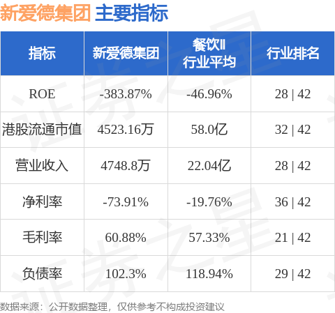 新爱德集团港股市值4523.16万港元,在餐饮Ⅱ行业中排名第32。主要指标见下表: