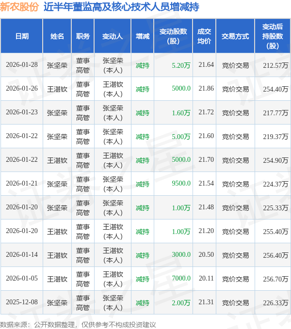 新农股份近半年内的董监高及核心技术人员增减持详情如下: