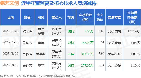 德艺文创近半年内的董监高及核心技术人员增减持详情如下:
